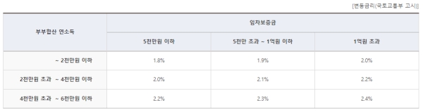 5. 대출신청인과 배우자의 합산 총소득이 5천만원 이하인 자에 한합니다. 단, 신혼가구, 혁신도시 이전 공공기관 종사자, 타 지역으로 이주하는 재개발 구역내 세입자, 다자녀가구, 2자녀 가구인 경우 소득기준은 6천만원 이하입니다.